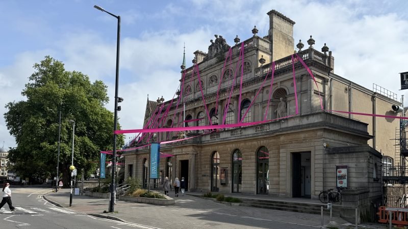 The 20cm-wide ribbon runs across the exterior of the Queen’s Road gallery, enters through windows and wraps around nearby lampposts and trees, as well as continuing onto the University of Bristol’s Beacon House and Victoria Methodist Church either side of the RWA.