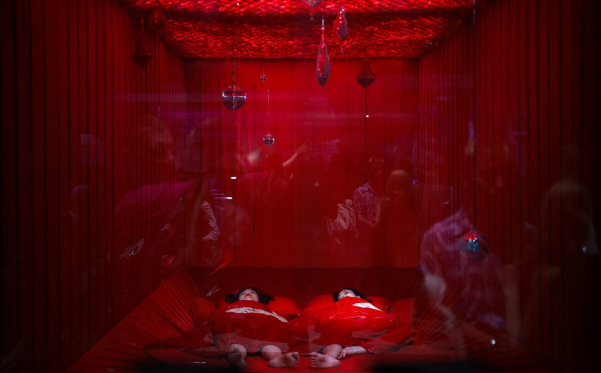 A red-lit installation with two women lying in a glowing red chamber surrounded by reflective hanging ornaments, viewed through a transparent barrier.