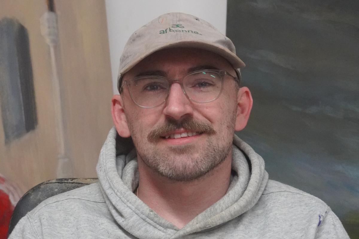The exhibition features six oil paintings that examine themes of decline, failed institutions, and disillusionment in Scotland and the UK.