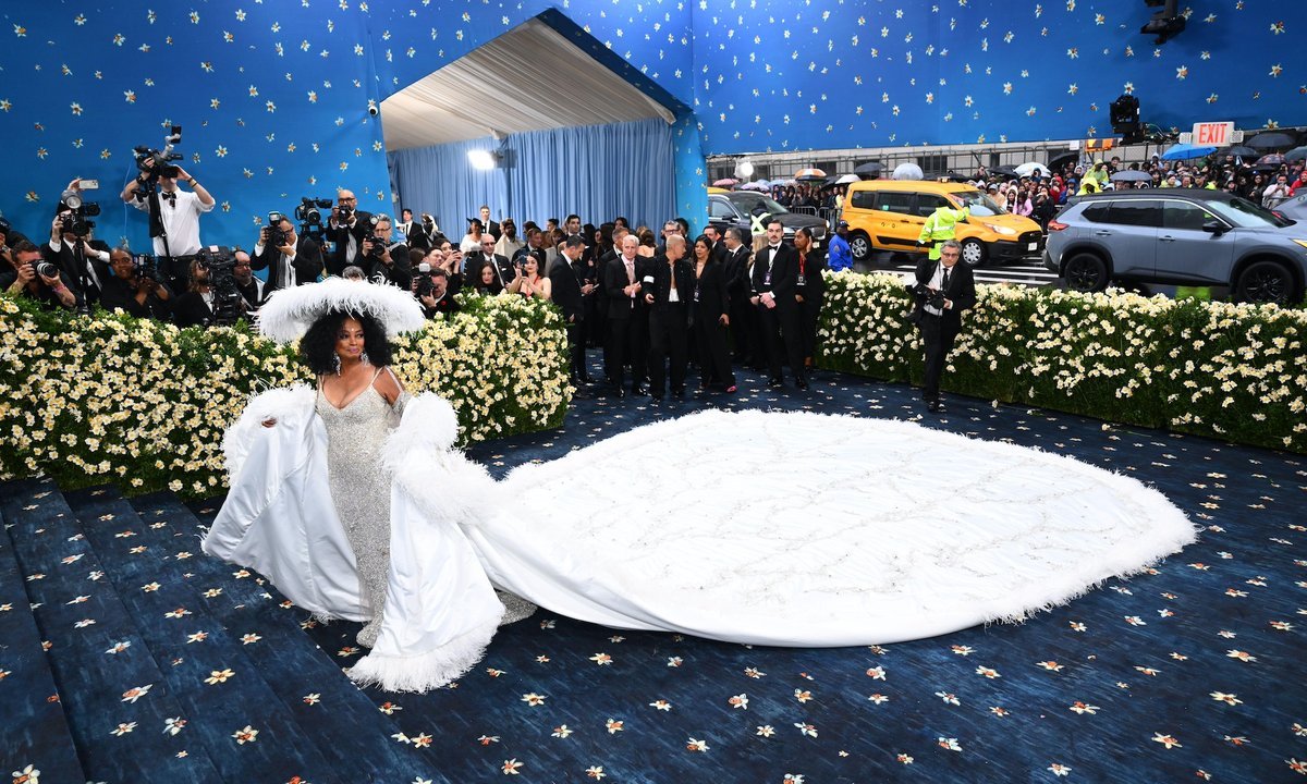 While most Met Gala attendees riffed on the cornerstone of the dandy’s wardrobe—a well-tailored suit—others opted for sumptuous gowns and capes that gave the Met’s 2019 Camp show and fundraiser theme a run for their money. Many stars paid homage to Talley’s penchant for lavish outerwear, in particular Alicia Keys and Serena Williams in Moncler, which conjured the editor’s favoured Norma Kamali Sleeping Bag puffer coats, and Nicole Scherzinger and Shakira in voluminous Prabal Gurung robes, fit for royalty. Ten years after Rihanna broke the internet with her yellow Guo Pei cape, which featured a 16ft train (a look that had Talley’s stamp of approval), it seemed like every guest’s outfit occupied the entirety of the Met’s famed staircase—though perhaps none more so than Diana Ross, in her white, 18ft robe by the Nigerian designer Ugo Mozie.