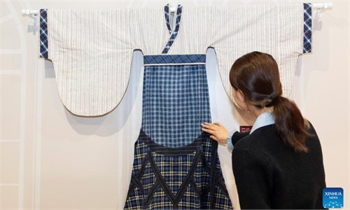 This photo taken on Nov. 21, 2025 shows a homespun Hanfu at an exhibition held at the Sensory Experience Gallery of the Palace Museum in Beijing, capital of China. Featuring artworks created by disabled artists from Shanghai, the exhibition kicked off here on Friday. Under the guidance of inheritors of intangible cultural heritages, these artists infused their love for life and reverence for culture into their works. Photo: Xinhua