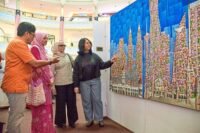 In our final appreciation of a work from the “Paper” exhibition, seven mysterious slender figures are shown in this acrylic artwork by Elise Ritter-Clough entitled “Messengers.” Artist Ritter-Clough explains that “the intention was to create an ethereal and other-worldly depiction of spirits.” Although the spirits are faceless, they are wearing warm-toned fabric with intricate patterns in red and orange with cool tones of blue and green behind them, again a tribute to the lively use of color on paper in artworks which may be seen aplenty in this exhibition which has something to offer for all.