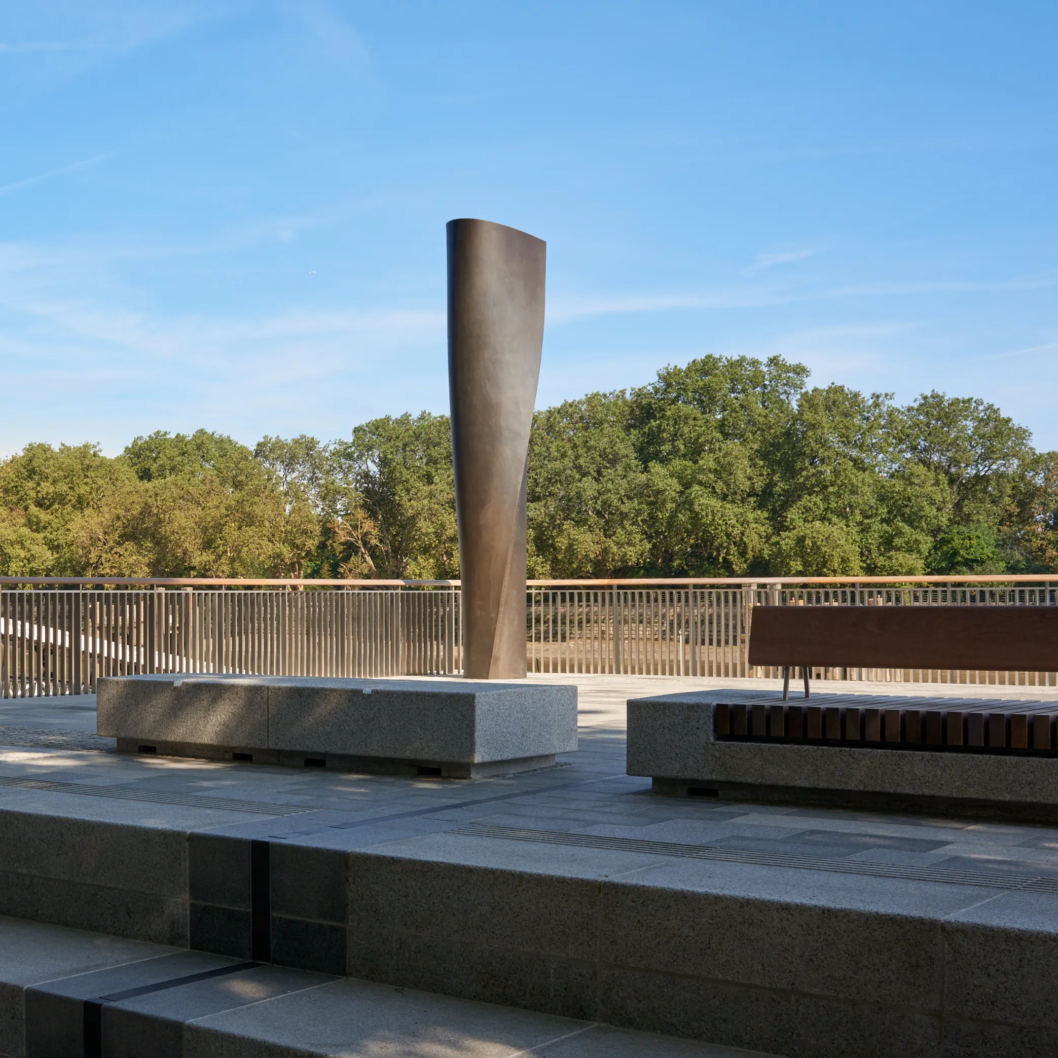 Located west of Putney Bridge, this 590m2 space is located above a 36m-deep shaft and 50m-long tunnel connecting the Combined Sewer Overflow beneath Putney Bridge to the main sewer tunnel. Designed for events with timber seating facing the river, it sits at the starting point of the annual University Boat Race, incorporating the original race marker stone. Granite is used as hard landscape for longevity, with new granite river walls mined from the same quarry as Putney Bridge. A 5.1m-high bronze ventilation column flags the below-ground engineering, while a kiosk and balustrade incorporate artworks by Claire Barclay: the latter bearing a cast of rowing oars forming part of the handrail.