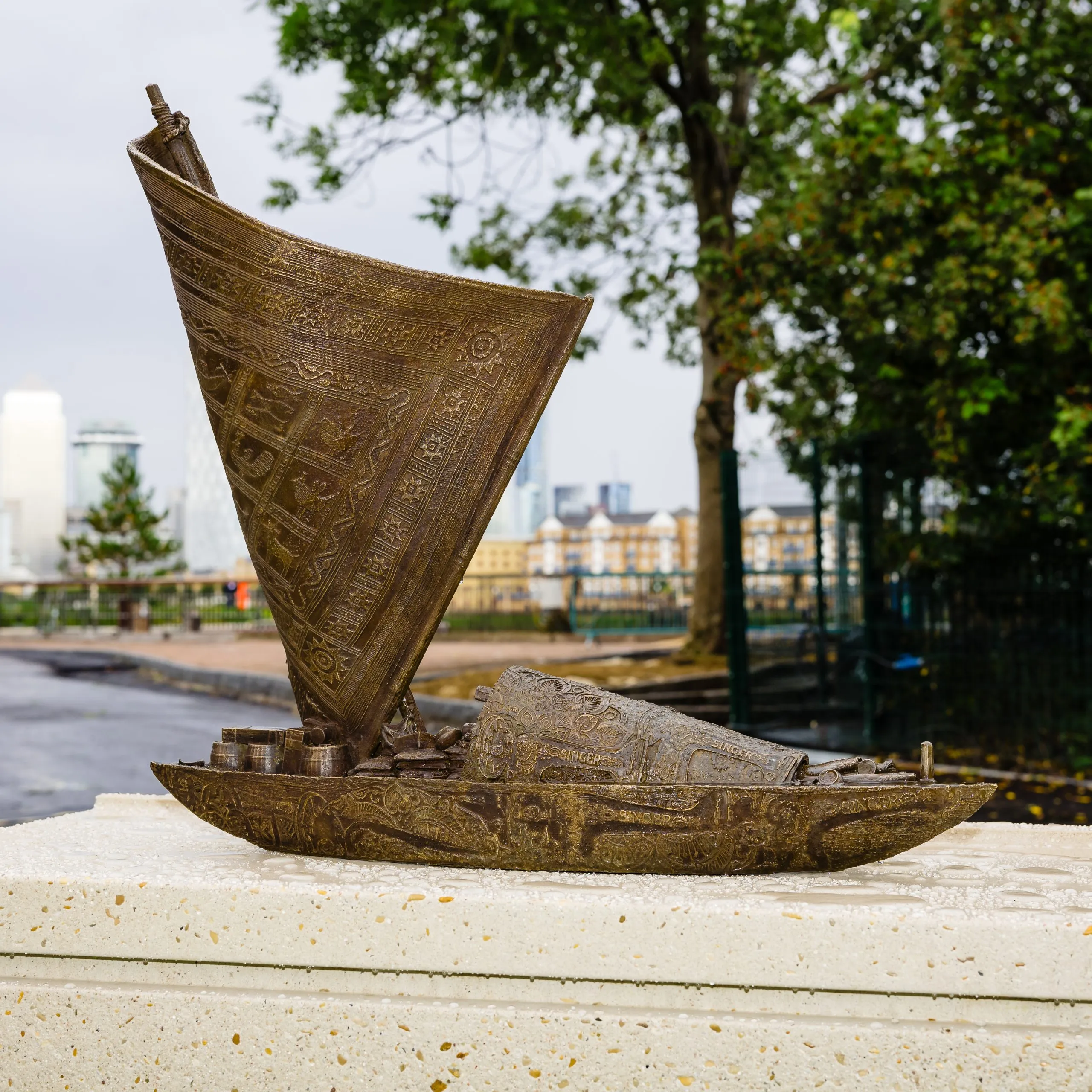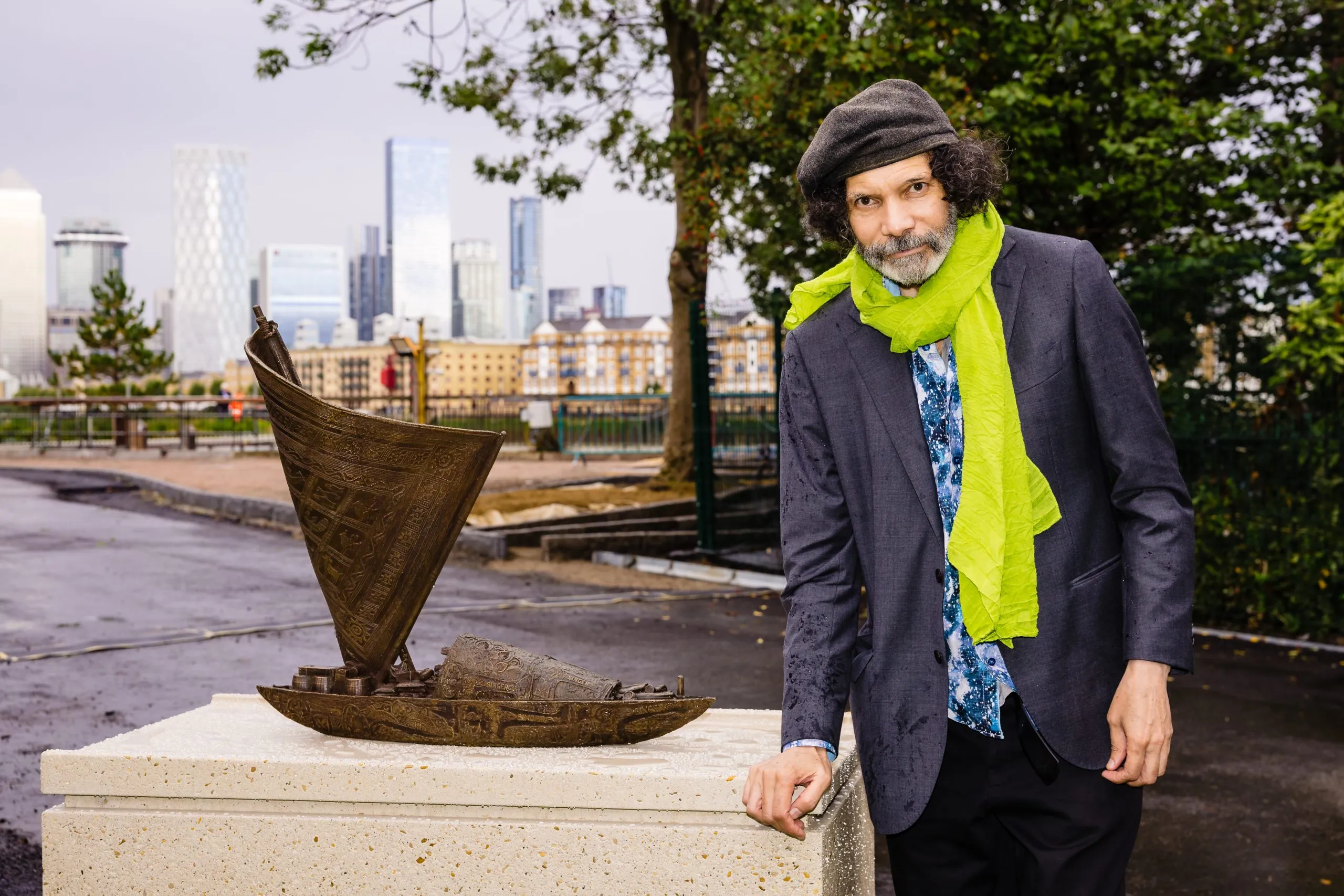 Artist Hew Locke OBE with part of his sculpture Cargoes, a flotilla of six cast bronze boats, installed at King Edward Memorial Park (photo: Danny Loo)