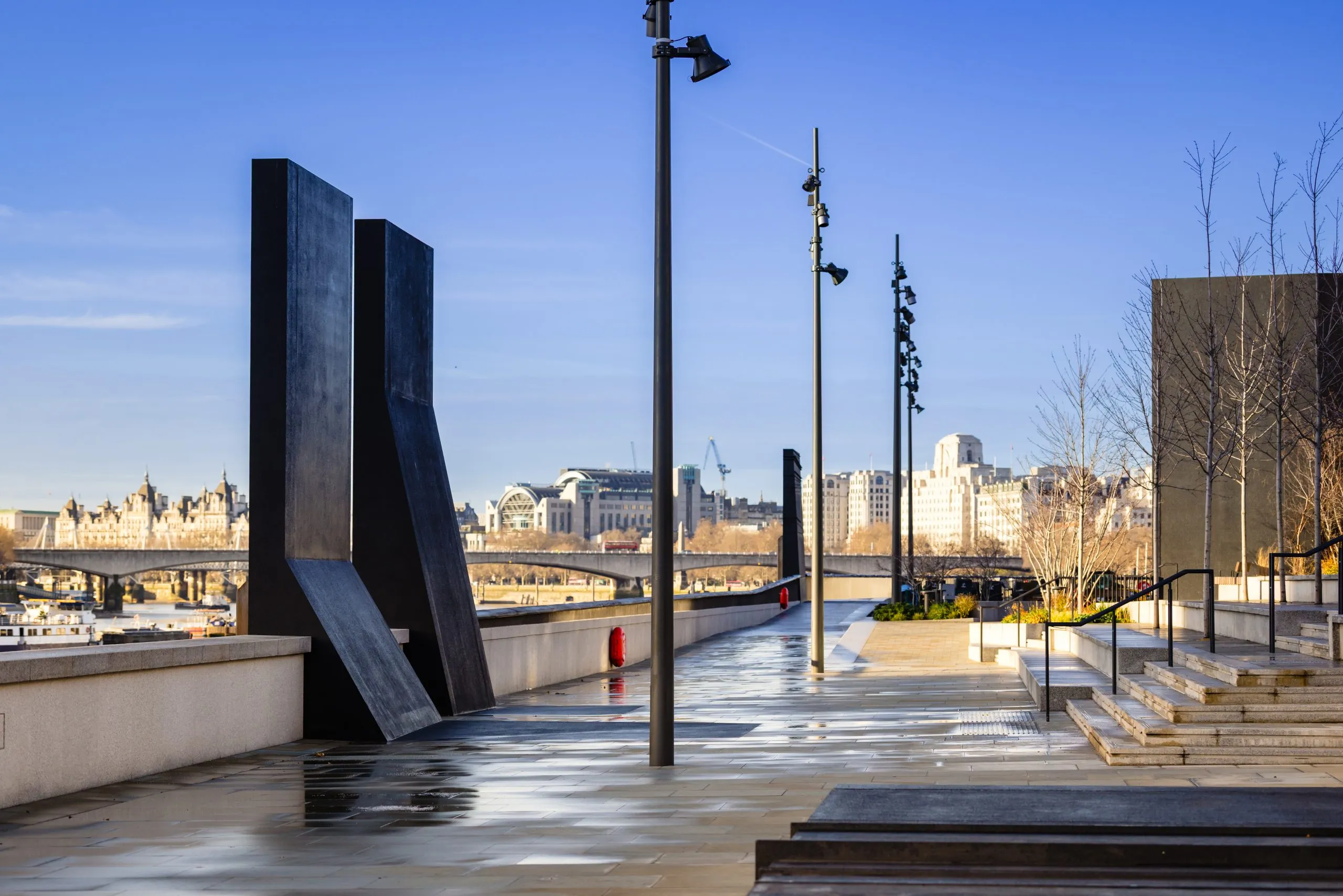 Nathan Coley’s Stages at Bazalgette Embankment reference the monumentality of Bazalgette’s work. His brief was also to work collaboratively with the design team to influence the form and experience of the landscape: so the sculptures are integrated into the river wall, connect levels and form seats and places for reflection, shaping the way in which you move across the site.