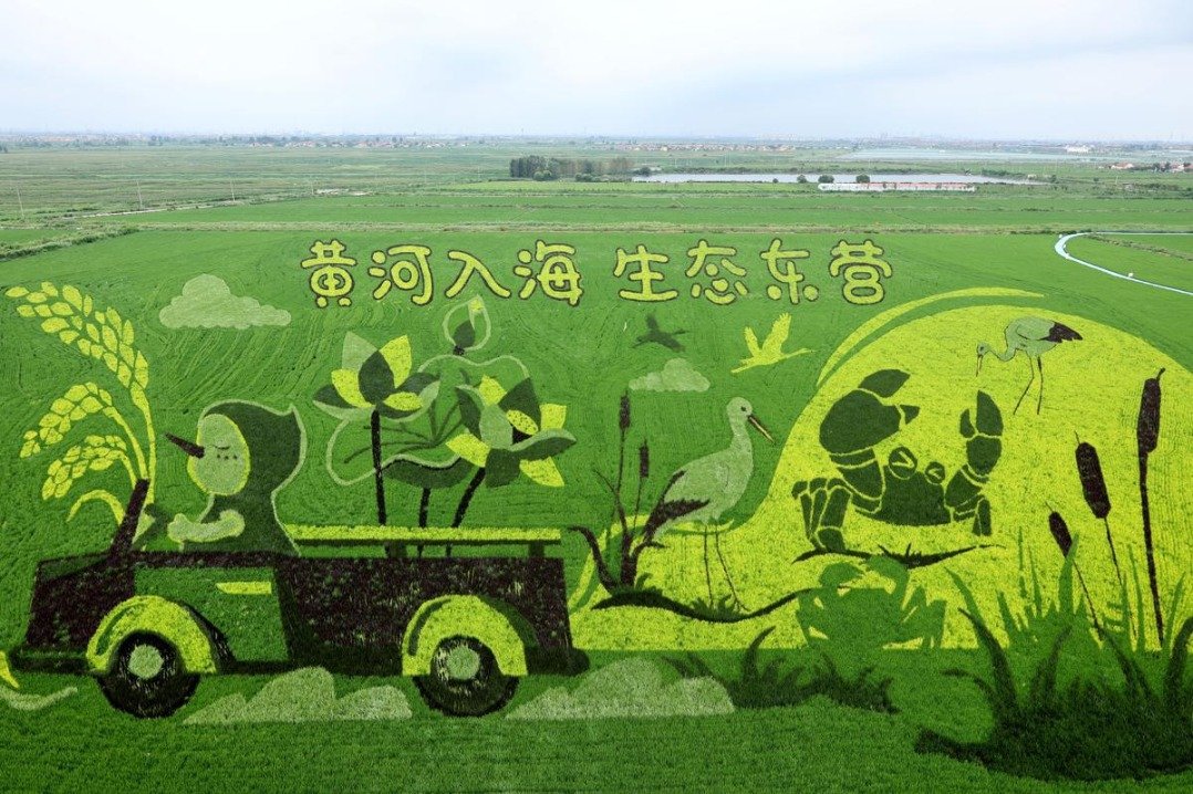 Two rice paddy artworks recently debuted in Yong’an town of Kenli district in Dongying, Shandong province, covering a combined 16 hectares. The striking installations, created using seven different colored rice varieties, pay tribute to China’s wartime resilience and local ecological conservation efforts.