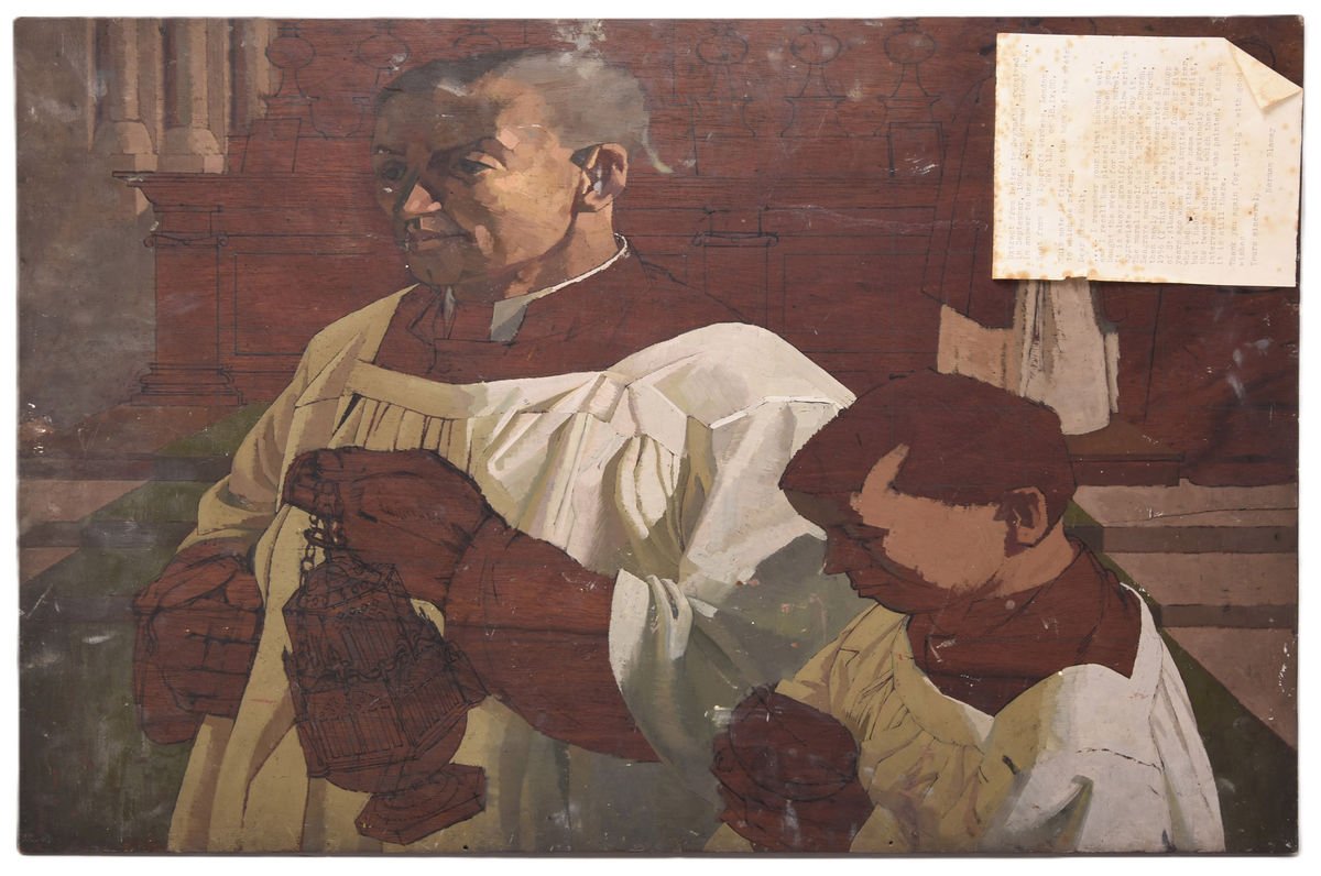Showing the enthroned Christ on one side and an Anglican priest and choirboy on the other side, the 66 x 43 cm oil on panel with pencil is believed to date to 1956 and valued at between £2,000 and £4,000.