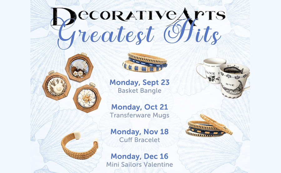 Three more Greatest Hits Decorative Arts series classes will be held: Transferware Mugs on October 21, Cuff Bracelet on November 18, and Mini Sailors Valentines on December 16. Each Greatest Hits class is held from 5 to 7 pm in the 1800 House. Register on the NHA website.