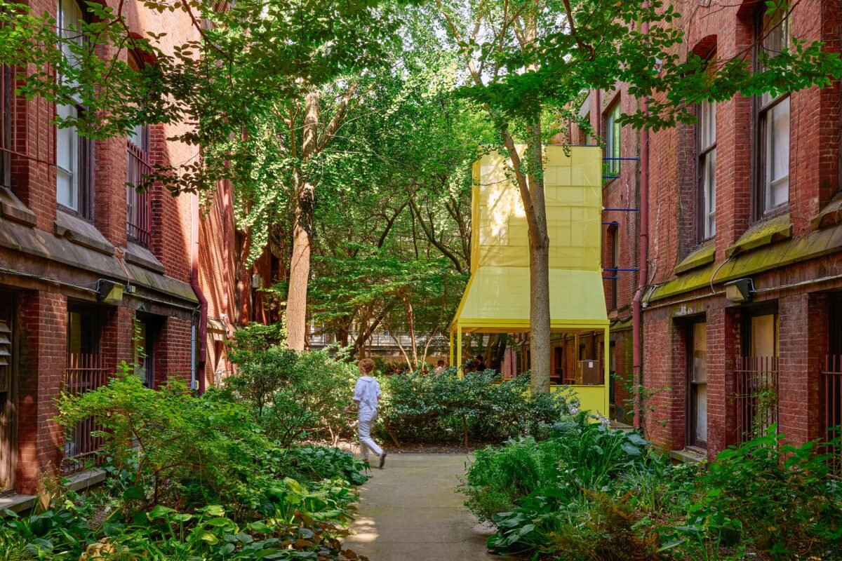 The pop-up bar’s central feature is a bright-yellow food and beverage pavilion with canted edges and a towering stack that references Kahn’s unrealised design. From here, visitors can grab a glass of natural wine, soft serve ice cream or order a small meal, courtesy chef Michael Ferreri, a local chef known for a minimal take on Sicilian cuisine.