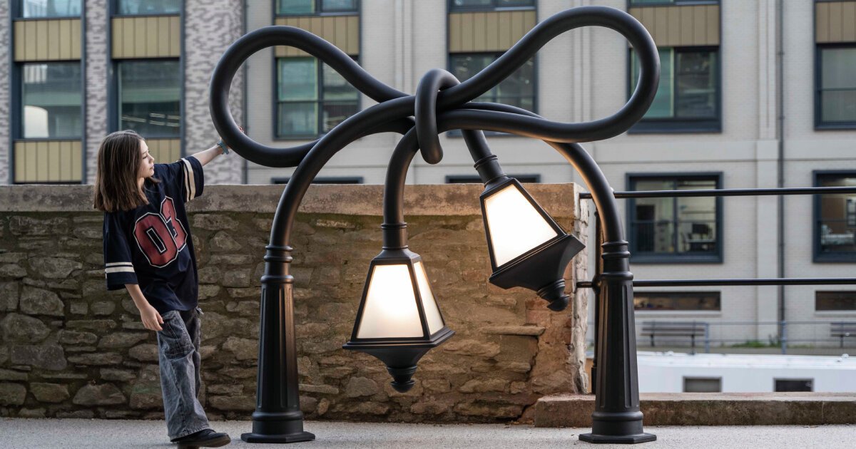 street lamps tied like a ribbon as one of Alex Chinneck’s recent sculptures at Assembly Bristol