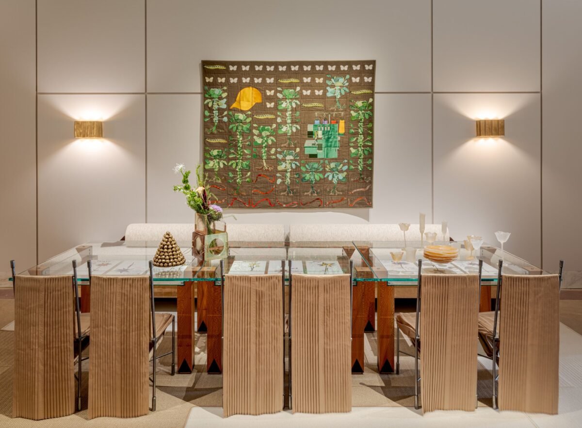 To the left, Estúdio Rain transforms the hall into a promenade of cultural exchange between France and Brazil, while Marion Mailaender reimagines the diplomatic dinner as a theatre of savoir-faire, where every object sparks dialogue.