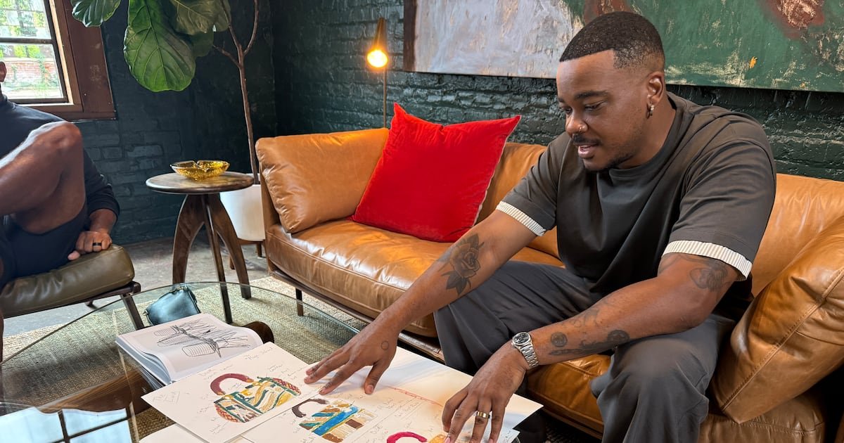 Patrick Eugène shows one of his conceptual drawings for a handbag he designed for Dior’s Lady Art project. The bag is inspired by the landscapes of Haiti and is built using fabrics like raffia to pay homage to his heritage. (Danielle Charbonneau/AJC)