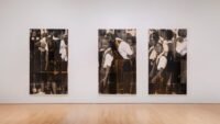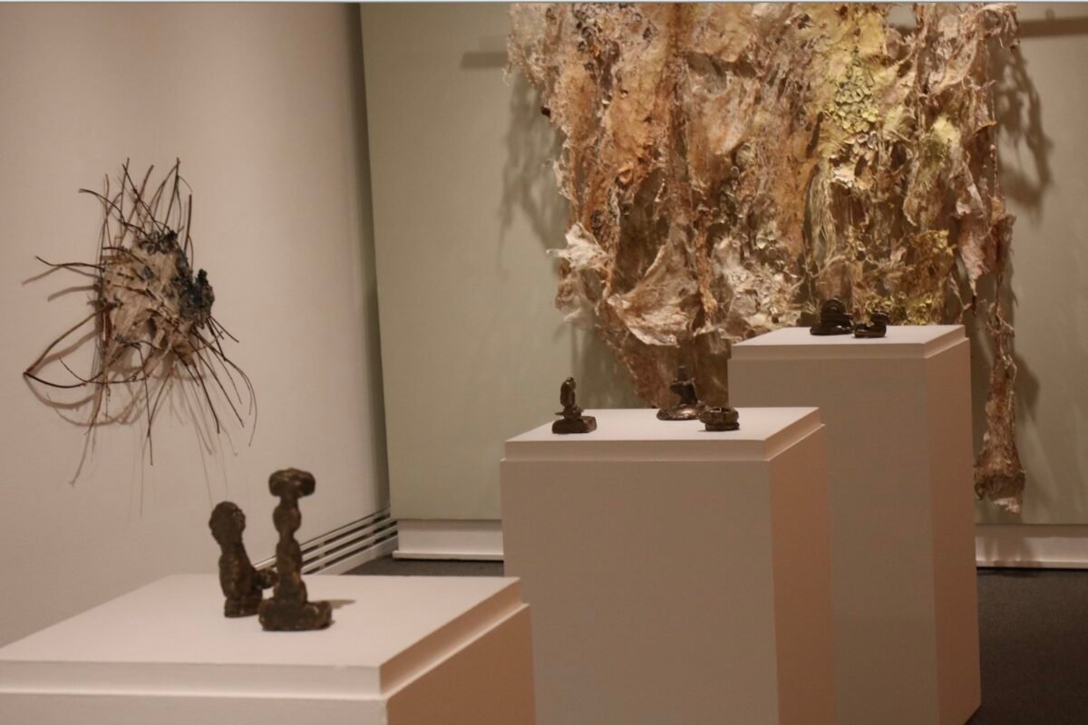 A large tapestry with rough edges and brown, green hues with the texture of dead leaves hangs on a wall further in the exhibit.